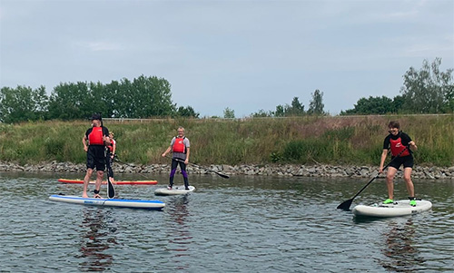 Die KursteilnehmerInnen waren konzentriert und mit Spaß bei der Sache. Nach ca. 45 min Theorie ging es auf den Dattel-Hamm-Kanal. Zunächst in der Kniehaltung, wagten alle TeilnehmerInnen auch den Stand auf dem Board, so dass verschiedene Techniken wie das Wenden, Bremsen, der Bogenschlag geübt wurden. Am Ende des Kurs gab es neben großer Begeisterung für den Sport auch ein VBE Dankeschön an die Kursleiter.